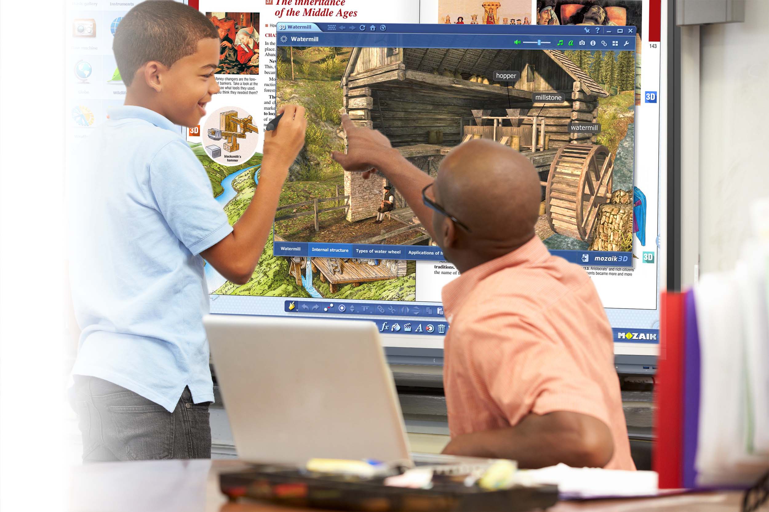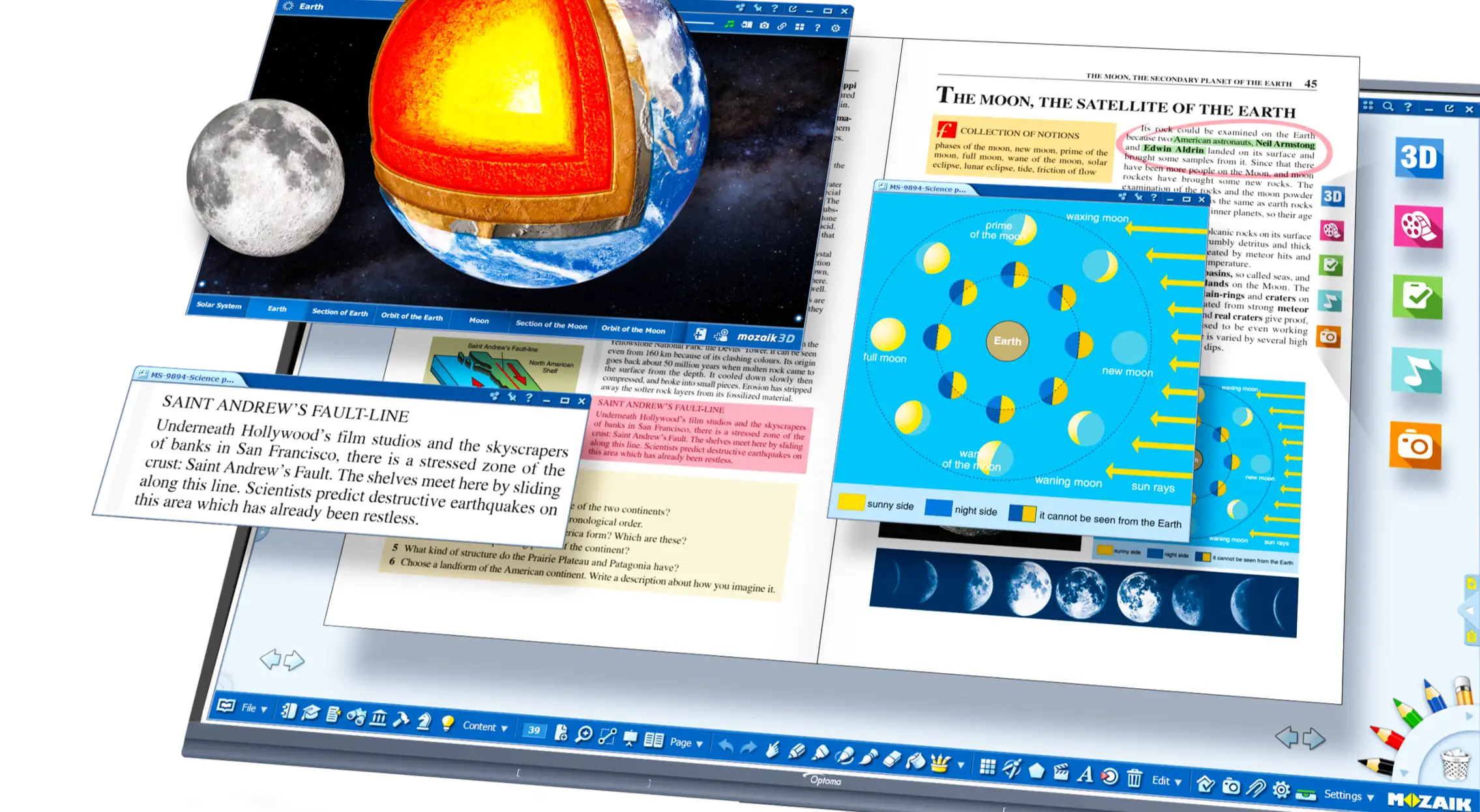 mozaBook è un software di presentazione progettato per l'uso su display interattivi in classe. Utilizzando il software, insegnanti e studenti possono creare presentazioni e arricchirle con scene 3D interattive, video didattici, immagini o esercizi dalla Libreria multimediale o con i propri file. Il software include una varietà di risorse didattiche, come applicazioni tematiche, giochi e scene 3D che coprono tutte le materie della scuola primaria e secondaria, che suscitano l'interesse degli studenti e li aiutano a comprendere meglio gli argomenti.