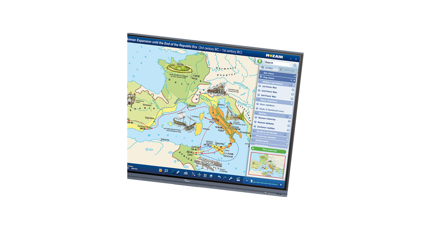 mozaMap offre atlanti interattivi che ampliano la gamma di strumenti disponibili per gli insegnanti di geografia e storia. Prepara le lezioni e insegna in modo efficiente utilizzando e personalizzando vari tipi di mappe e gli elementi al loro interno.